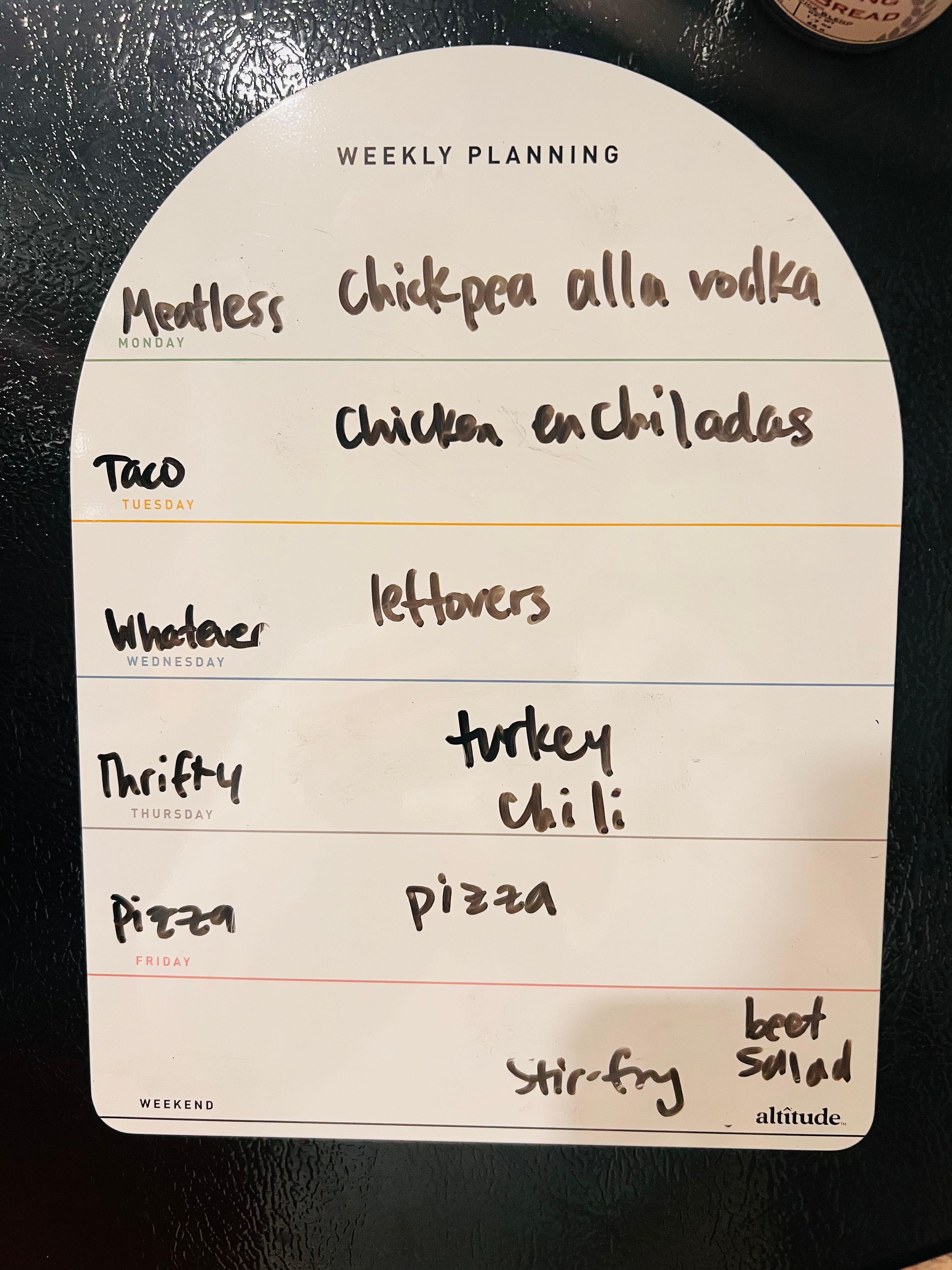 My exact little dry-erase board calendar is no longer available from Target, but there are many other versions, like this one on Amazon. For some reason, designating Monday as “meatless,” Tuesday as “tacos,” Wednesday as “whatever,” etc., writing what I’m going to make down, and thinking ahead is bringing me joy in this season. (Psssh… sometimes I pivot; no one cares.)