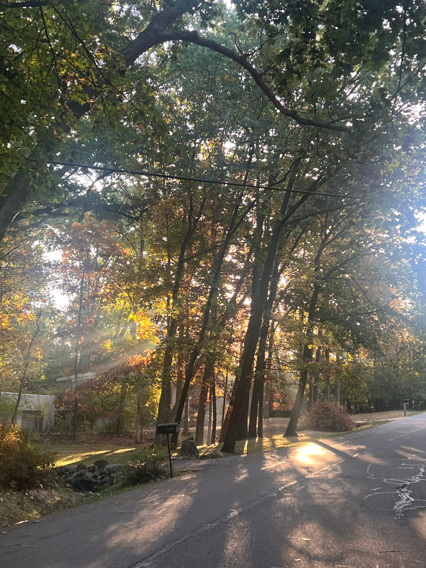 I promised myself early in the school year that I would prioritize movement and keep going once drop-off was done. I was already up the hill, for goodness’ sake! And so I put my earbuds in and keep walking, most mornings two miles, meandering through our suburban neighborhood, which, I discovered, actually has quite a number of dirt roads and beautiful fall foliage, plus deer, rabbits, birds, and breathtaking sunlight bursting through trees.