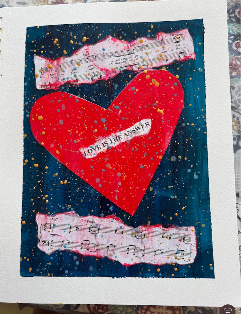 A few weeks back, we got to Chapter 6, Ode to Belonging, and we did the exercise called “self-portrait,” where we name our values and are invited to create a work of art that represents what we like about ourselves and what matters most to us. I invited a couple of folks to share theirs, and two artists volunteered. They’ve given me permission to share here.